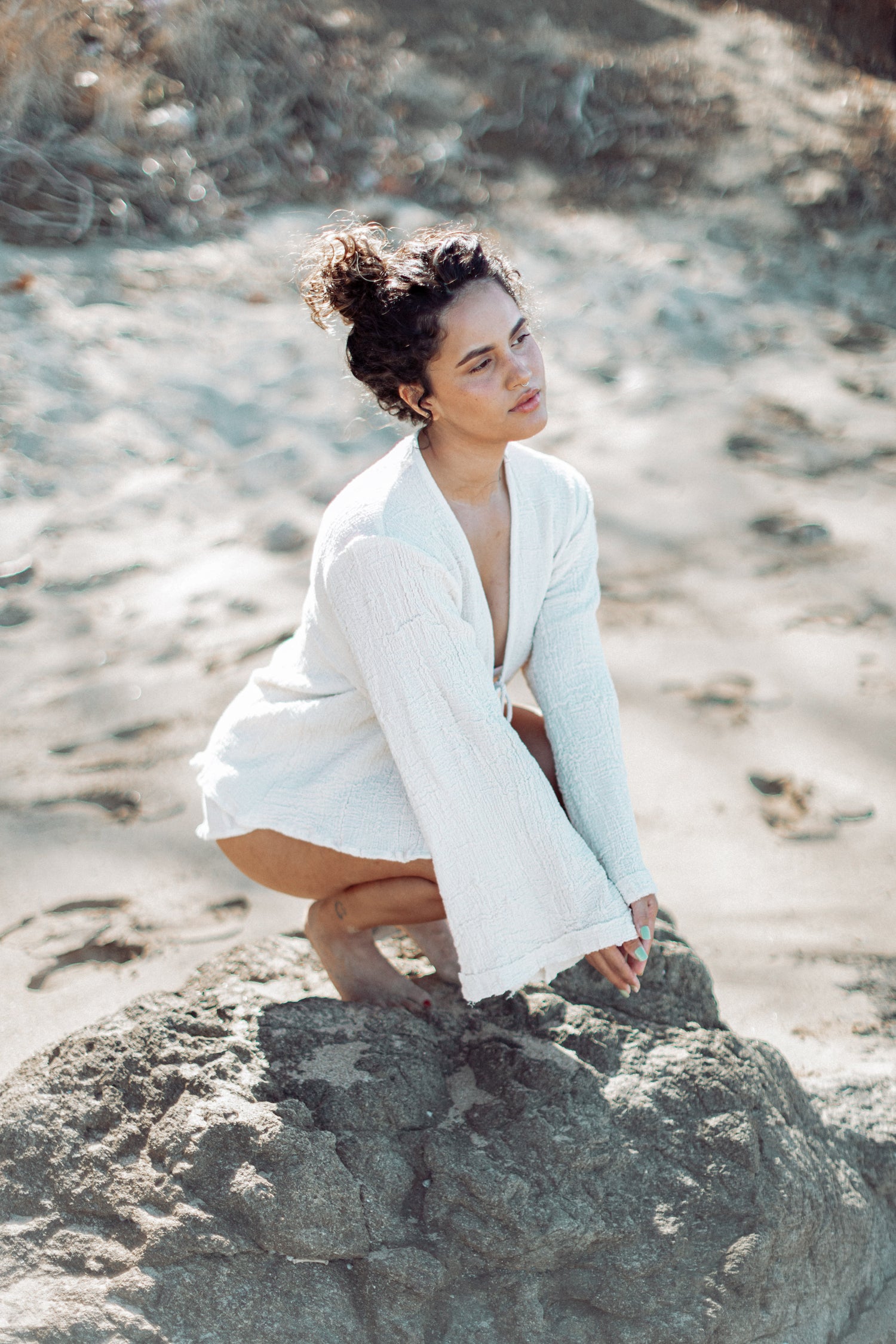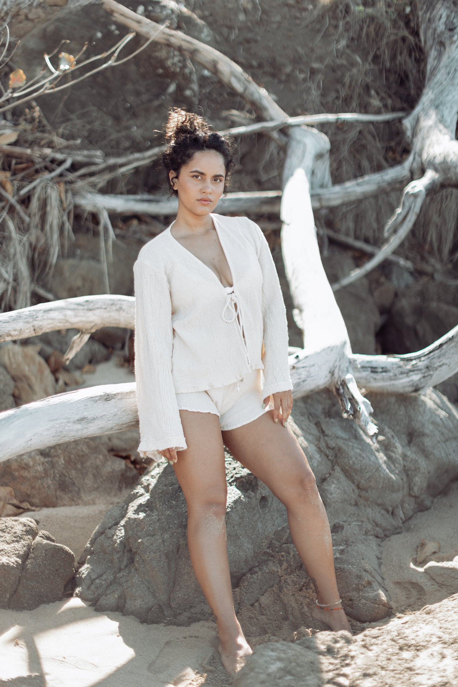 If you are a free-spirited soul and love to feel comfortable, the bell sleeves of the Dream Tunic will give you this feeling. This is the perfect addition to your bohemian wardrobe. You can use this tunic alone or as a layer over your favorite dress or top. The cowrie shell and brass detail in the front tie make this piece a statement.
