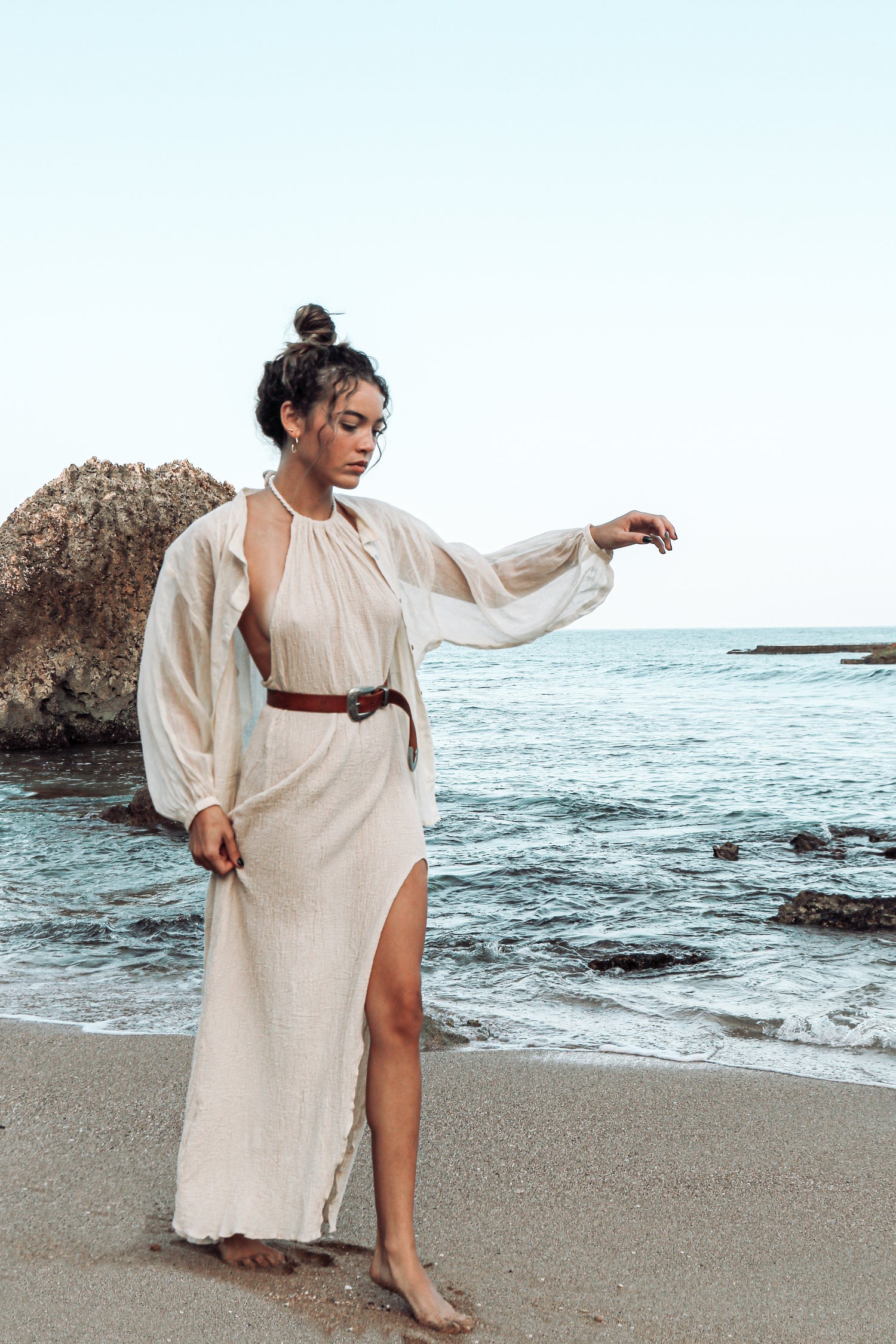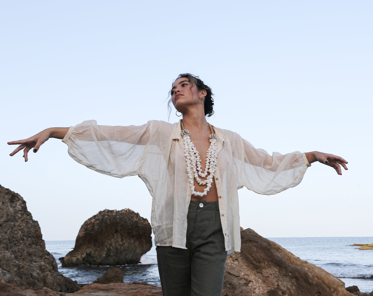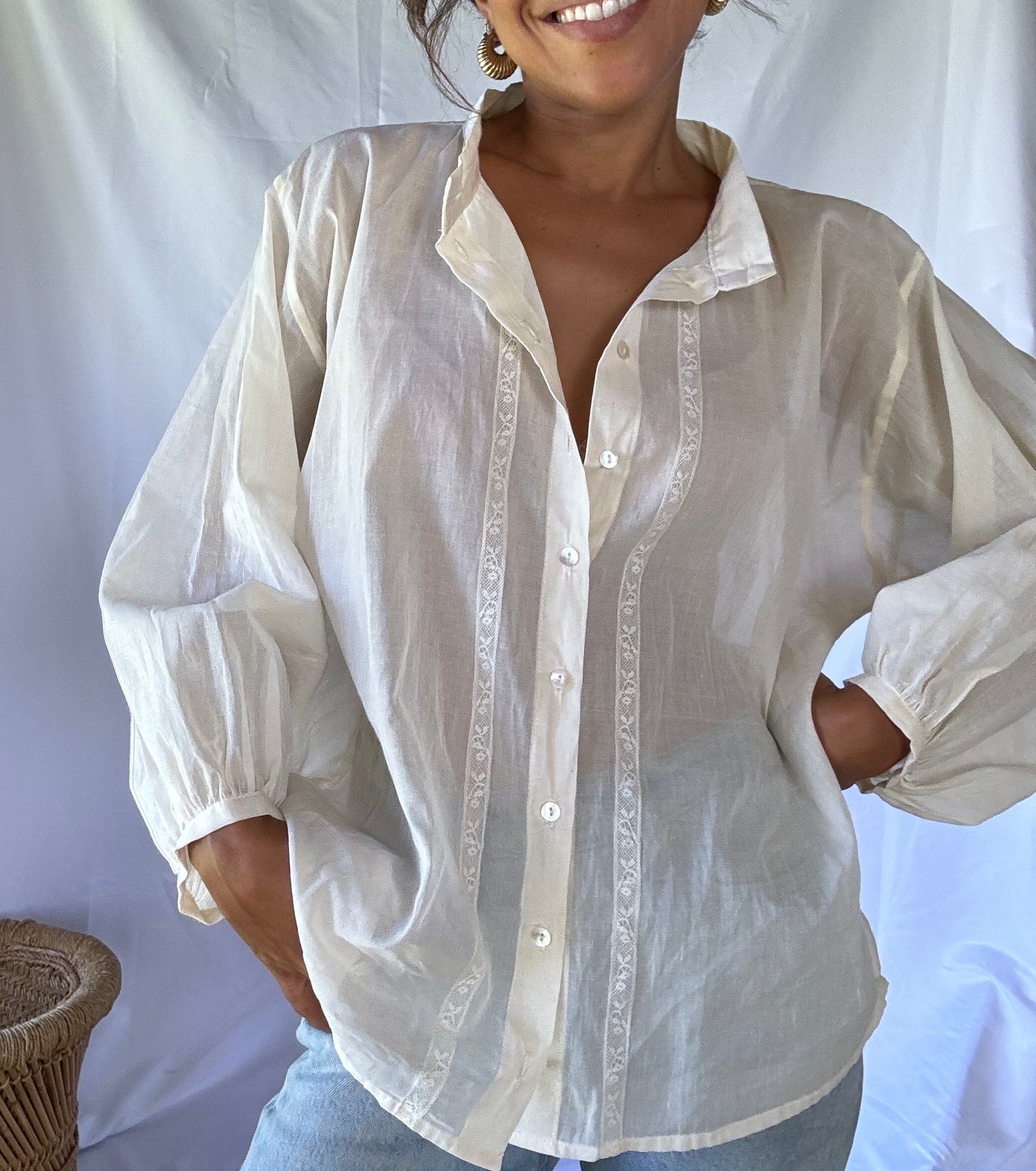 The Dolman Top is a loose fit top with a romantic feeling. If you are a free-spirited soul and love to feel comfortable but with style, this is the perfect addition to your wardrobe. Sleeves are oversized, it has a a vintage valencienne detail, and buttons made of akoya shell. You can either use this top completely buttoned up, half way open and/or as another layer.