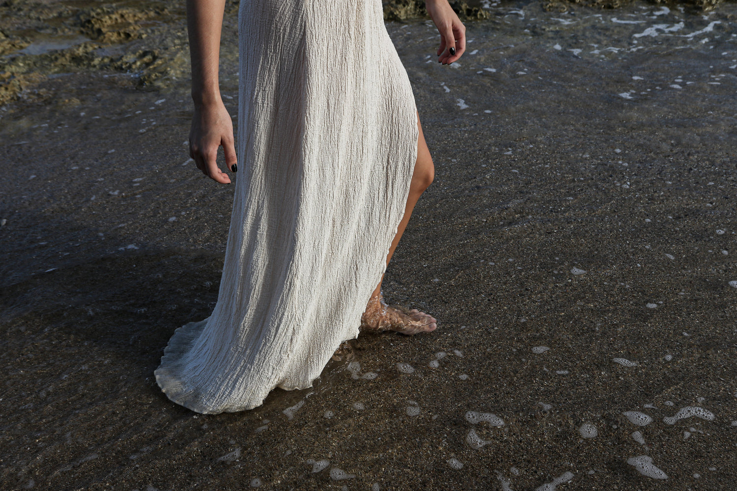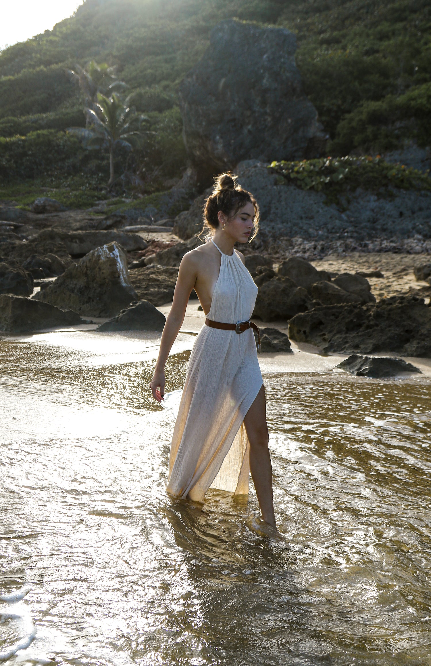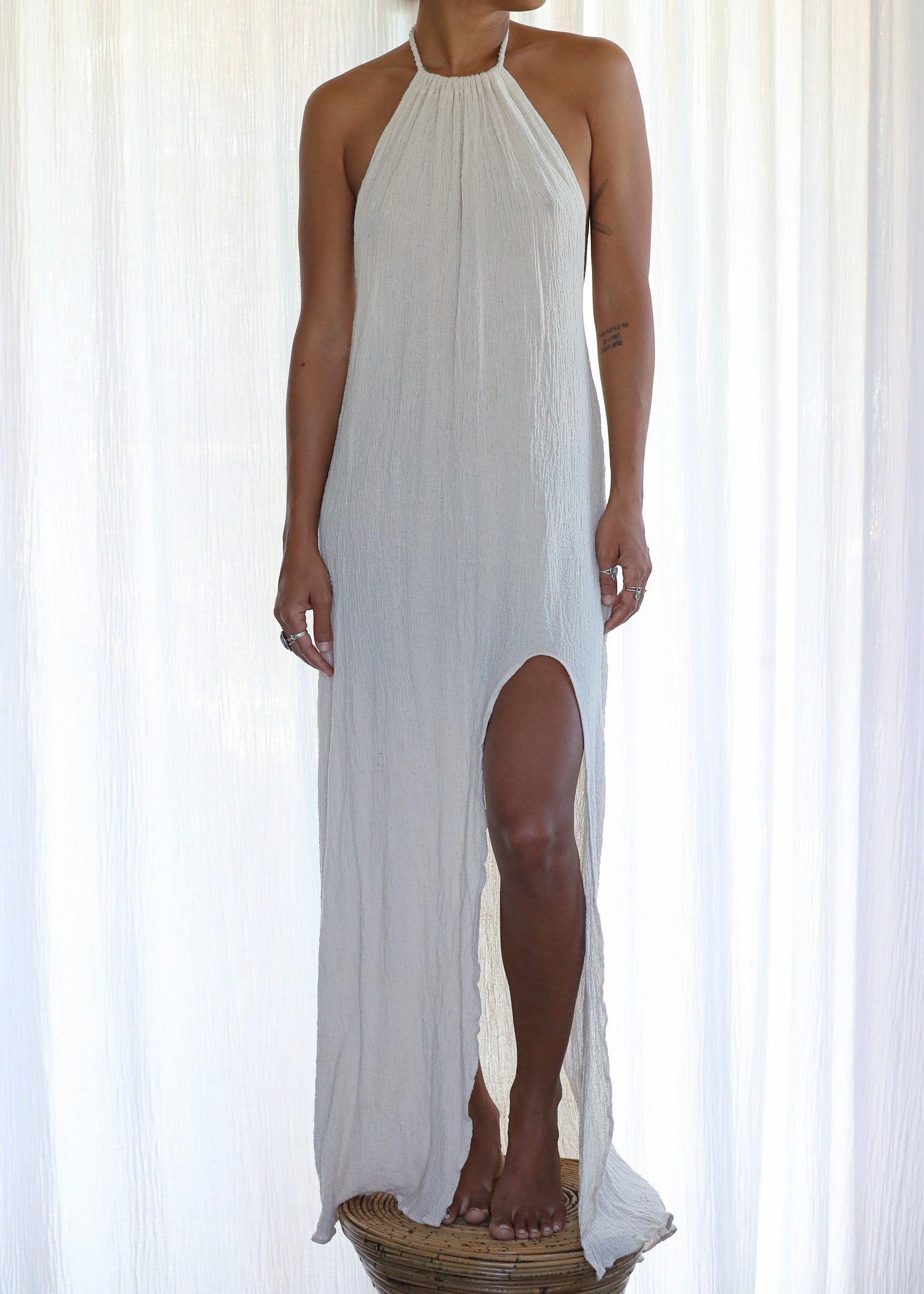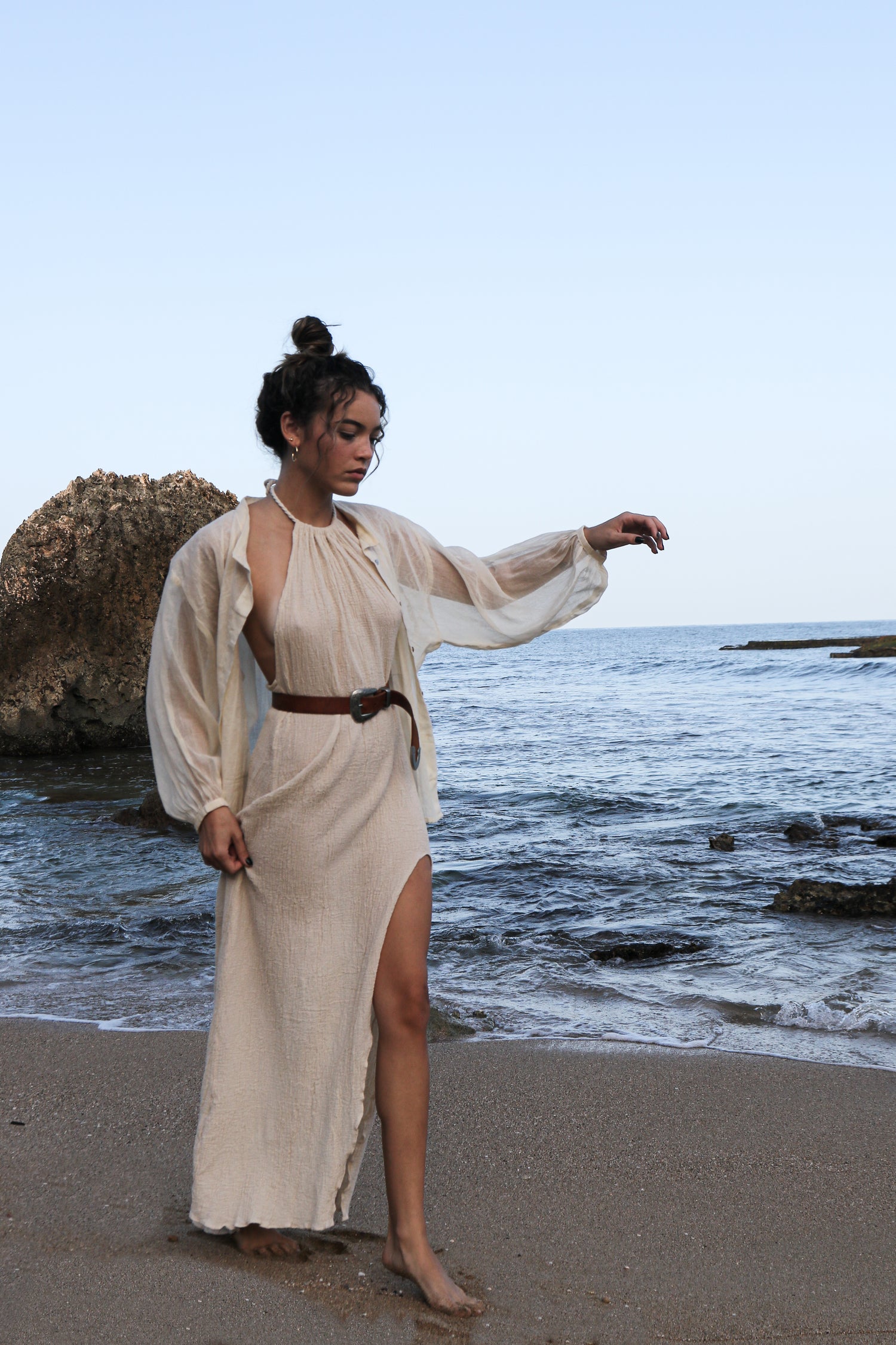 This gem is made of a soft crinkle organic cotton fabric. Halter style with a completely open back cleavage. It also has a leg split opening, which gives this romantic piece more freedom. Very comfortable and sexy. Slightly stretchy fabric.