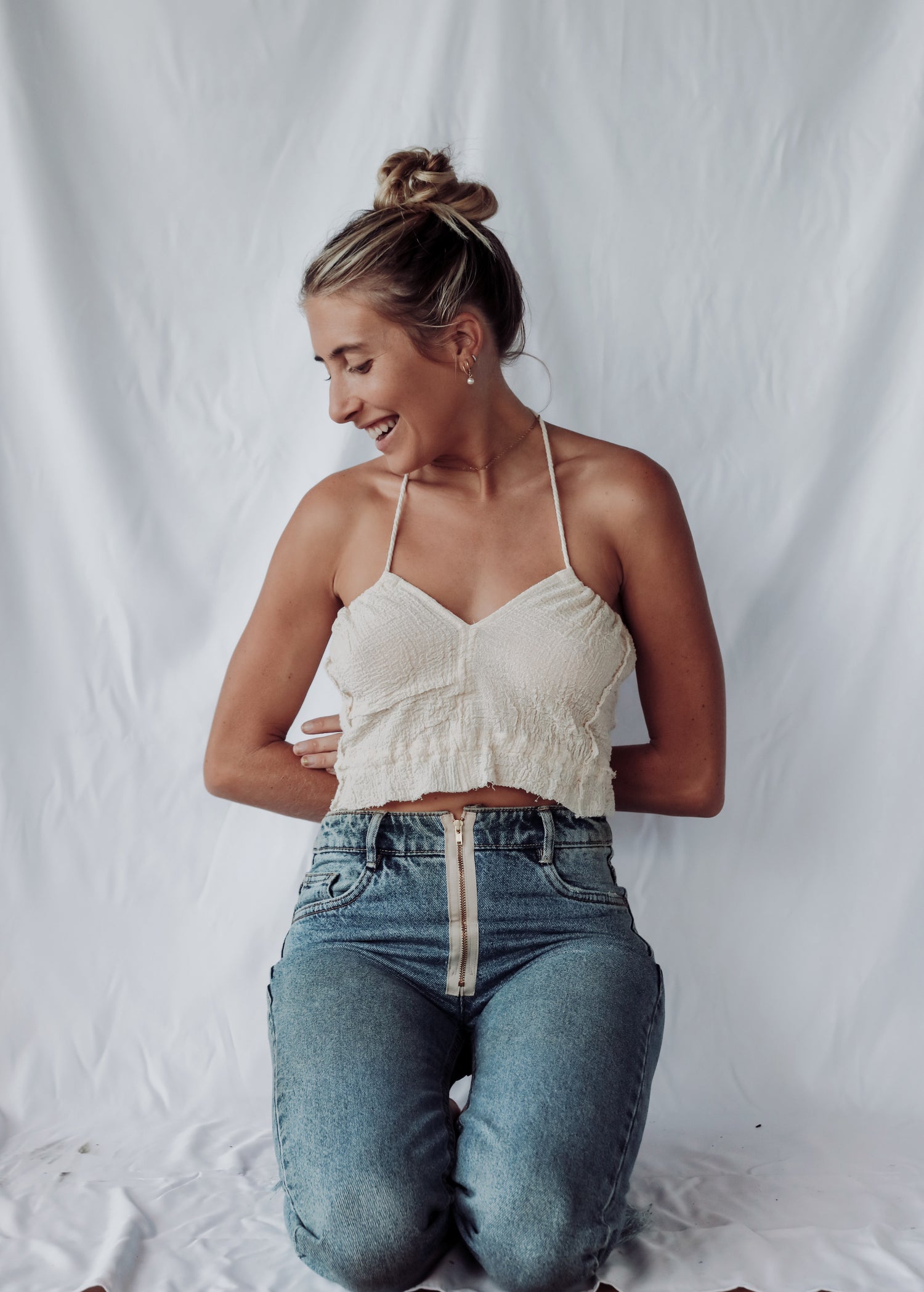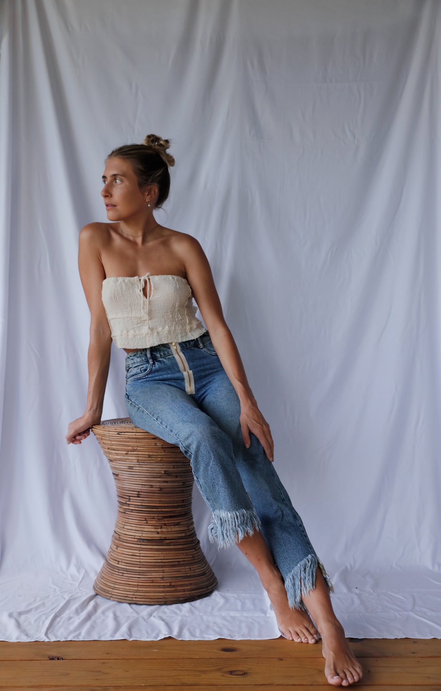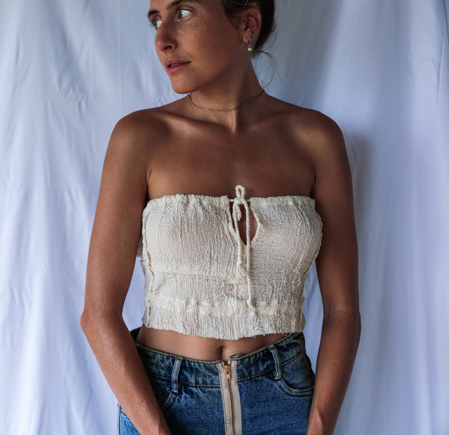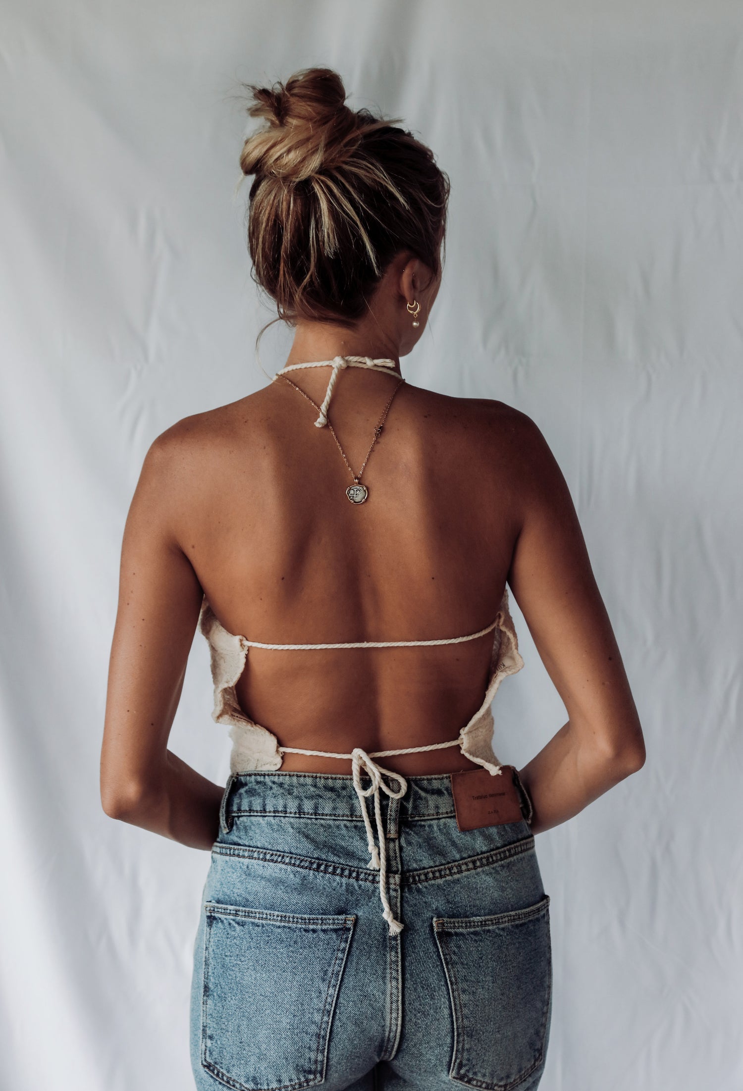 Jibarita Top is an upcycled top made from our main fabric scraps. Get creative with this versatile top. It has an open back, and you can adjust it with the macrame ropes. It is a one size due to the nature of its production. It fits from XS to Medium.