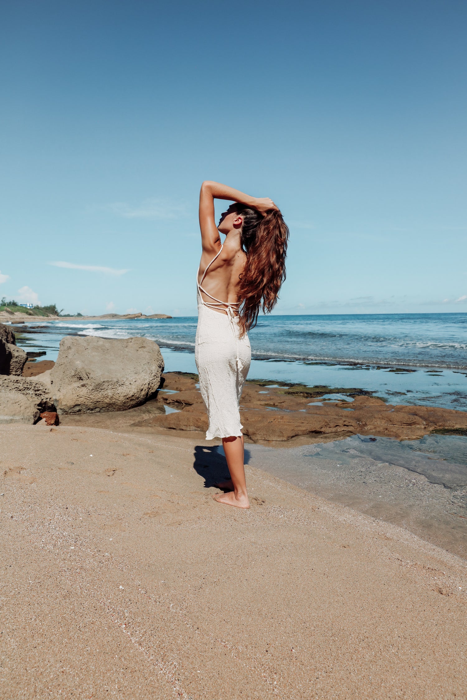 This dress is everything. You can make this midi dress look casual or formal. Made of a soft crinkle organic cotton fabric. Open back cleavage with a continuous cotton cord that makes it adjustable. Slightly stretch fabric. This dress is one of our favorites, and it will be one of yours too!