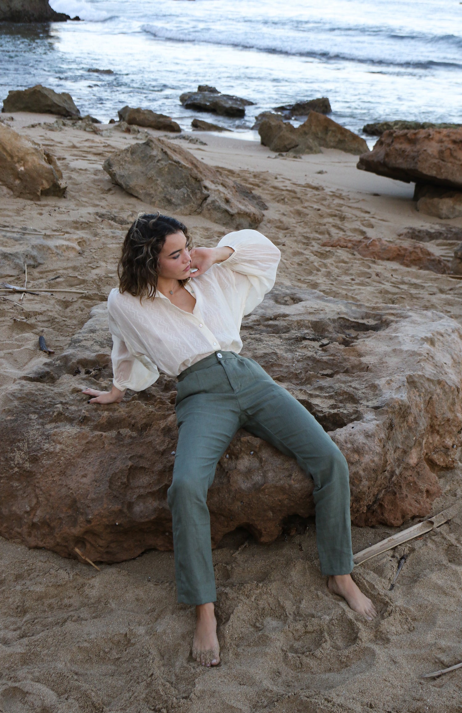 One of my favorites. This trouser is inspired by the 50s vintage pants. It doesn’t stretch, and has a loose fit with straight legs. Since it is made of medium weight linen is perfect for warm weather. These trouser matches perfectly with our French Top.